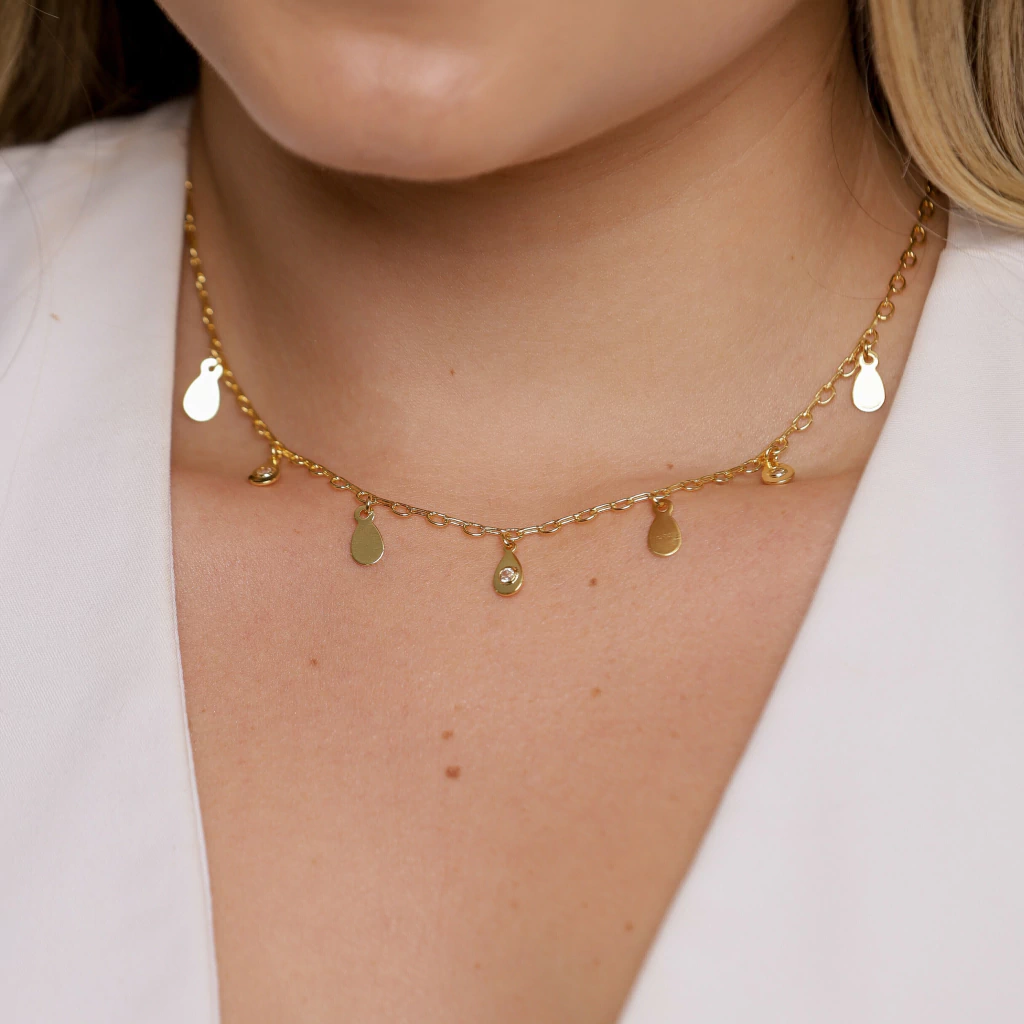 Delicado e sofisticado, o Colar Gotas Cravejadas traz o brilho na medida certa para destacar qualquer produção. Suas gotas cuidadosamente cravejadas proporcionam um toque elegante e feminino, perfeito para usar sozinho ou combinar com outros colares em um mix cheio de estilo.