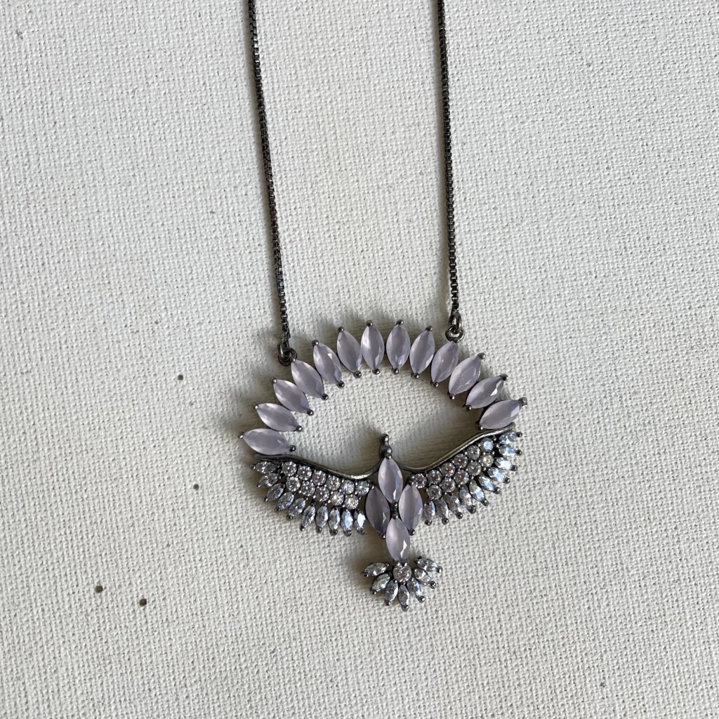 Com design marcante e elegante, o Colar Asa é uma peça que transmite leveza e poder. Banho em ródio negro, ele traz um pingente em formato de asa estilizada, cravejado com zircônias pedras em forma de gota na tonalidade lavanda combinação que garante brilho e sofisticação na medida certa. Um colar que transforma qualquer look com personalidade e charme.