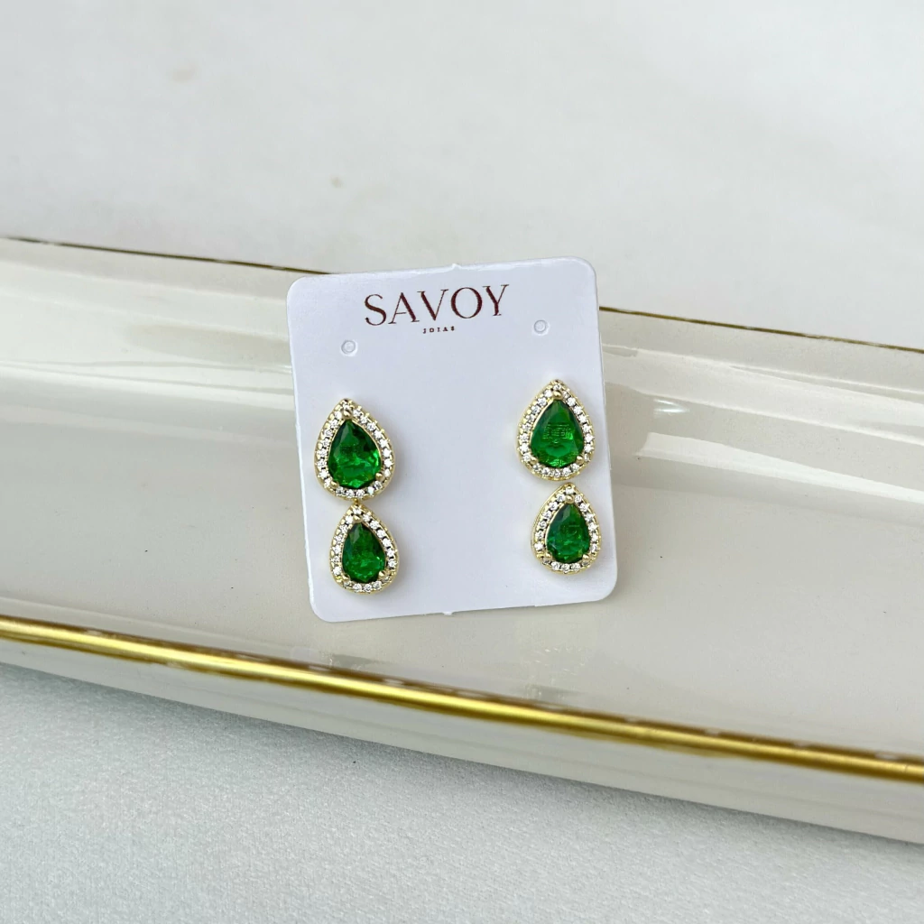 Elegância em dobro! O brinco Dupla Gota Zircônia Esmeralda é a escolha perfeita para quem busca sofisticação com um toque de cor. Com duas delicadas pedras em formato de gota, cravejadas com zircônias em tom de esmeralda, essa peça oferece brilho intenso e acabamento refinado.