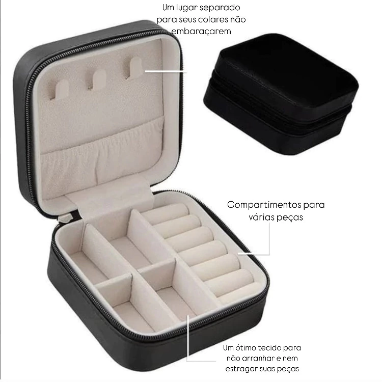 Mantenha suas joias sempre organizadas e protegidas com elegância. Este porta-joias preto combina praticidade e sofisticação, ideal para quem valoriza cada detalhe. Com divisórias internas inteligentes, ele acomoda anéis, brincos, colares e pulseiras com muito estilo. Seu acabamento refinado em tom preto dá um toque moderno e discreto, perfeito para qualquer ambiente.